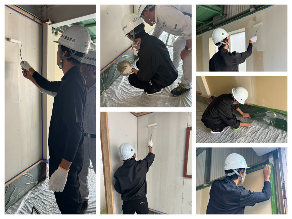 「ここはもう少し筆を寝かせて」「力の入れ方はこれくらい」と、現場の生きたノウハウをマンツーマンで伝授。若手も真剣な表情で、一塗り一塗り、技術を自分のものにしていました。
