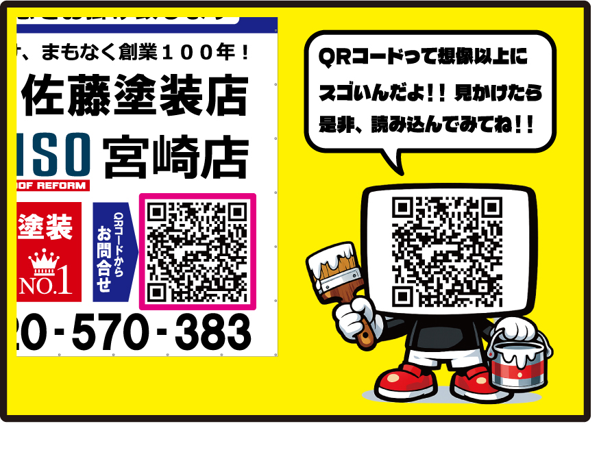 例えば、現場のシート看板。足場に設置されていることが多いので、ビルでいうと2~3階くらいの高さになることもあります。ところが、弊社が「ラウンドワンスタジアム宮崎店」様を施工させていただいた時は、2~3階どころか、ほぼ最上階付近に設置したシート看板のQRコードが1階からでもしっかりと読み取れました!!