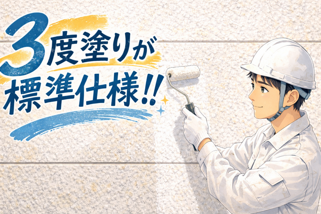 外壁・屋根塗装は、手塗りローラー工法を基本としています。ローラーで丁寧に塗り重ねることで、塗膜の厚みを確保し、耐久性を高めます。また当社では、3度塗りを標準仕様としています。