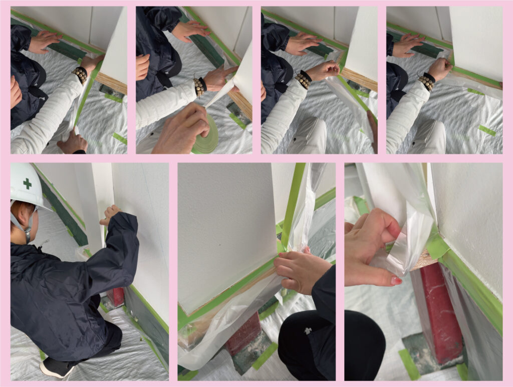 塗装の仕上がりを左右する大切な工程、養生(マスカー貼り)。当社では、現場に出る前にこうした基礎をしっかり練習できる環境を整えています!訓練では、ベテランの男性職員が担当。無駄のない動きでスムーズに仕上げる技術は、まさに“プロの仕事” 間近で見て学べるのも、大きな魅力です!