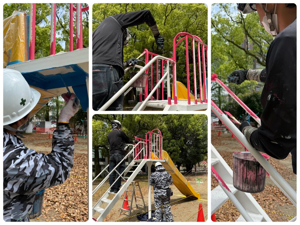 ふくろうオブジェ現場の別班をご紹介!すべり台塗装の様子