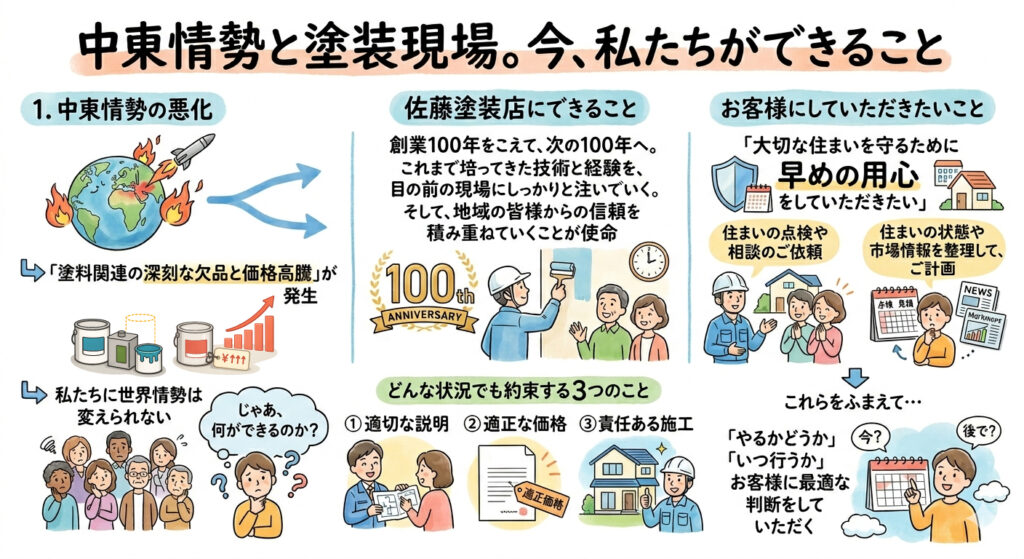 連日報道されている中東情勢の悪化。その影響は、私たち塗装業界にも確実に出てきています。現在、原油などの供給難により、「塗料関連の深刻な欠品と価格高騰」が発生しています。しかしながら、材料費が上がったからといって、塗布量を減らしたり…、工程を省いたり…などといったことは、当然ですが一切ありません。私たちの仕事は、ただ塗ることではなく、お客様の暮らしを守ることだからです。