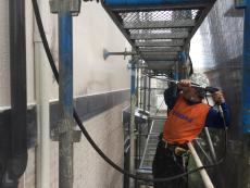 | 2階外壁塗装の着工前です | 高圧洗浄状況です | 埃やチョーキングを除去していきます |