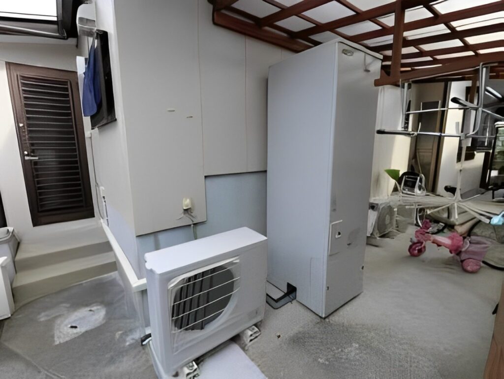 続いて勝手口付近にある電気温水器を撤去して、エコキュートに交換していきます。その後リモコンなどの機器を取り付けていきます。
