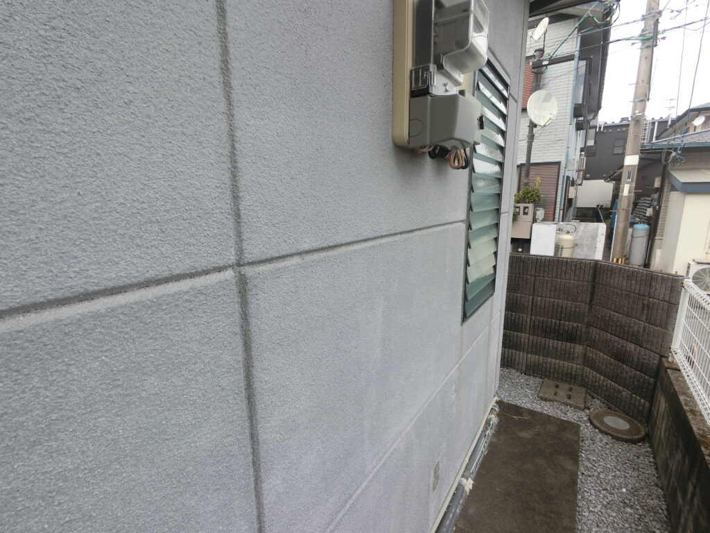 全体として色あせや劣化現象であるチョーキング (触れると指に白っぽい粉のつく現象) がみられます。カビや藻類による汚染もみられますので、バイオ洗浄で汚れを根こそぎ浮かし、高圧洗浄で丁寧に洗い流していきます。