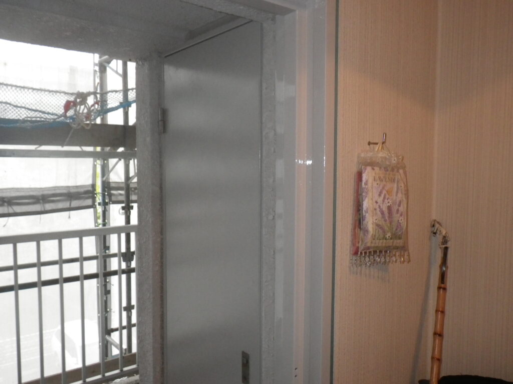 事前に工事計画をお知らせし、入居者のご協力を得て、在宅時に玄関枠塗装